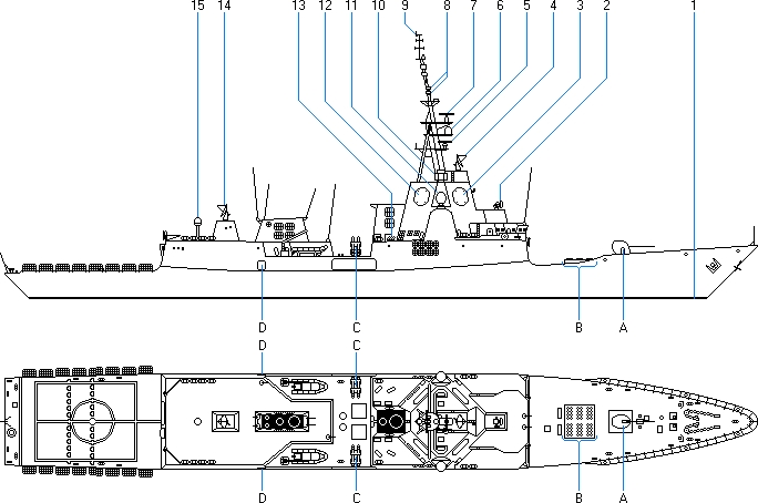 - Kompleks pionowych wyrzutni VLS (Vertical Launching System) złożony z sześciu modułów firmy Martin Marietta Corporation model Mk 41 dla: