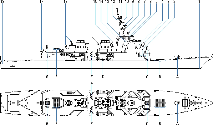 - Kompleks pionowych wyrzutni VLS (Vertical Launching System) złożony z ośmiu modułów firmy Martin Marietta Corporation model Mk 41 dla: