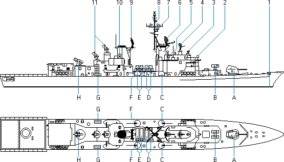- Wyrzutnia torped 324 mm. model Mk 32 dla torped firmy ATK (Alliant TechSystems) model Mk 46 Mod. 2 lub firmy Whitehead model A-244