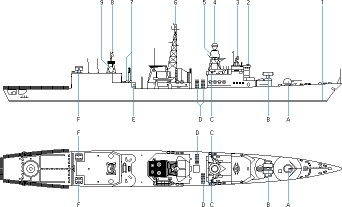 - Wyrzutnie torped 324 mm. model Mk 32 Mod. 9 dla torped firmy ATK (Alliant TechSystems) model Mk 46 Mod. 2 lub model DM 4A1
