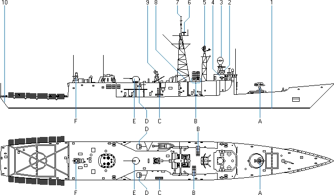 - Układ przedziwdziałania elektronicznego ECM (Electronic CounterMeasures) model Sidekick systemu walki elektronicznej model SHIELDS (Ships' HIgh-power ELectronic Defence System)