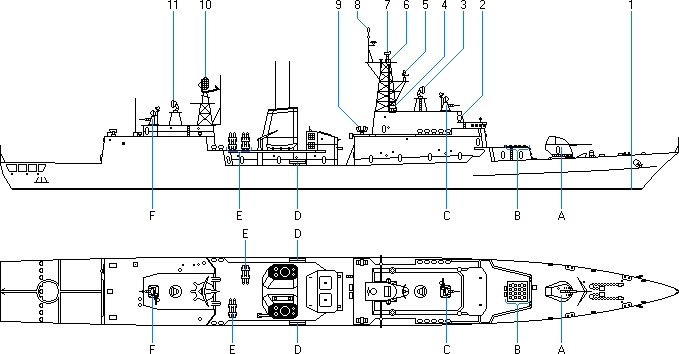 - Pionowa wyrzutnia VLS (Vertical Launching System) firmy Raytheon model Mk 48 Mod. 2 dla rakiet firmy Raytheon/NATO model RIM-7P Sea Sparrow