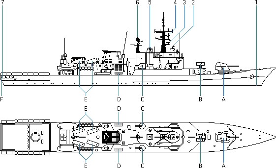 - Wyrzutnia torped 324 mm. model Mk 32 dla torped firmy ATK (Alliant TechSystems) model Mk 46 Mod. 2 lub firmy Whitehead model A-244