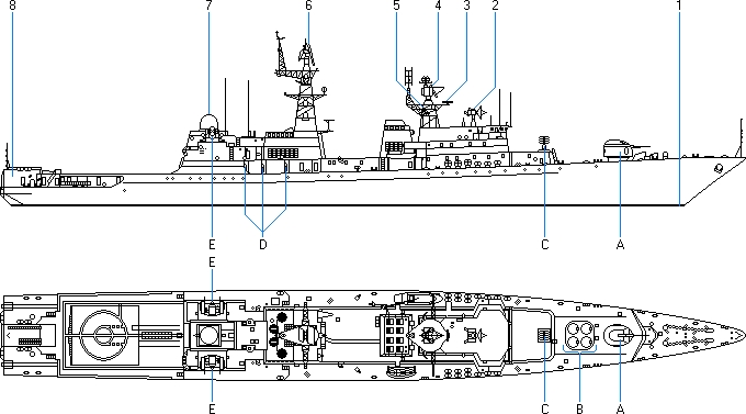 - Wyrzutnie VLS (Vertical Launching System) model 4S-95 systemu model 3K-95 Kindżał dla rakiet model 9M-330-2 (SA-N-9 Gaunlet)