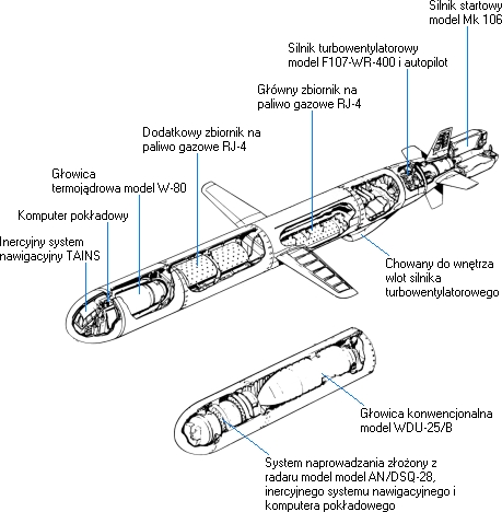 | Schemat budowy pocisku model xGM-109A TLAM-N oraz przednia część pocisków model xGM-109B TASM. Tylnia część jest identyczna w obu odmianach rakiet. |